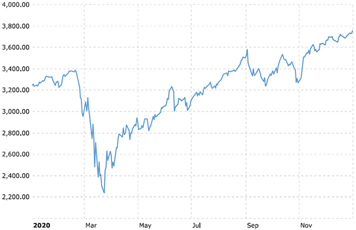 Figure 1: S&P 500 Historical Prices, Jan-Dec 2020