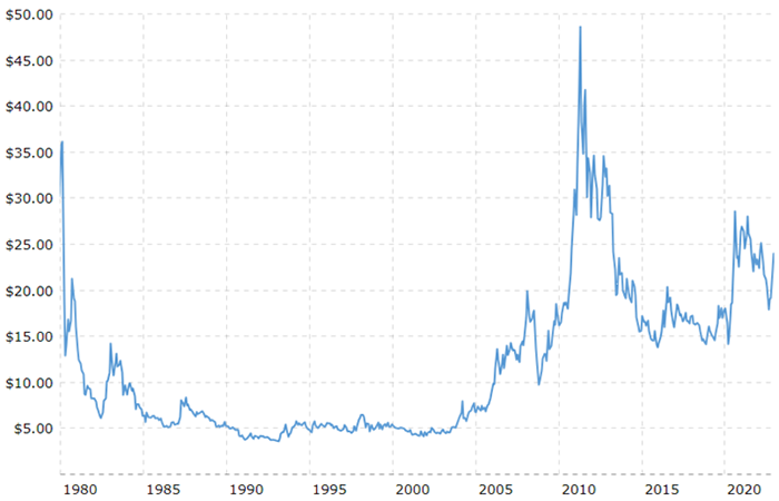 43: “Silver Prices—100 Year Historical Chart,” Macrotrends, accessed June 21, 2023, www.macrotrends.net/1470/historical-silver-prices-100-year-chart; “Platinum Prices—Interactive Historical Chart,” Macrotrends, accessed June 21, 2023, www.macrotrends.net/2540/platinum-prices-historical-chart-data.