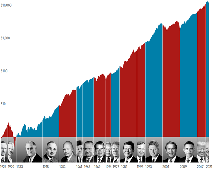 21: “How Much Impact Does the President Have on Stocks?” Dimensional, November 3, 2022, www.dimensional.com/us-en/insights/how-much-impact-does-the-president-have-on-stocks. Past performance is not a guarantee of future results. Indices are not available for direct investment. Their performance does not reflect the expenses associated with the management of an actual portfolio. In US dollars. Growth of wealth shows the growth of a hypothetical investment of $1 in the securities in the S&P 500 Index. S&P data © 2022 S&P Dow Jones Indices LLC, a division of S&P Global. All rights reserved. Data presented in the growth of wealth chart is hypothetical and assumes reinvestment of income and no transaction costs or taxes. The chart is for illustrative purposes only and is not indicative of any investment. Dimensional Fund Advisors LP is an investment advisor registered with the Securities and Exchange Commission.