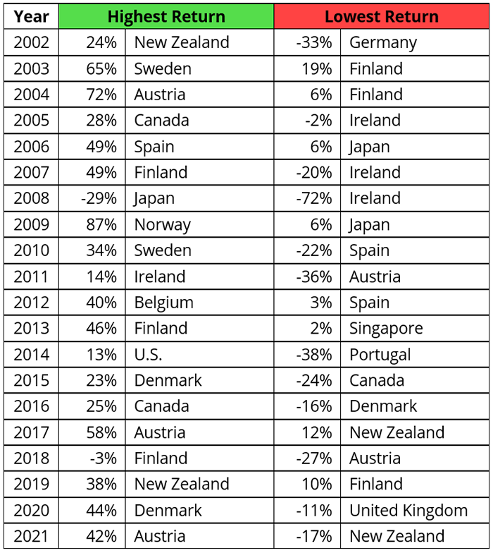 8: “Which Country Will Outperform? Here’s Why It Shouldn’t Matter,” Dimensional, January 17, 2023, www.dimensional.com/us-en/insights/which-country-will-outperform-heres-why-it-shouldnt-matter. In U.S. dollars. MSCI country indices (net dividends) for each country listed. Does not include Israel, which MSCI classified as an emerging market prior to May 2010.