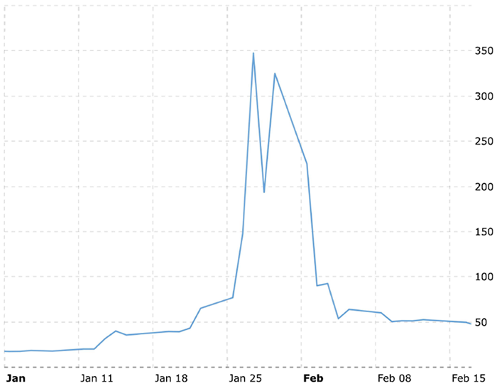 Figure 9: GameStop closing Prices, Jan 1-Feb 15, 2021