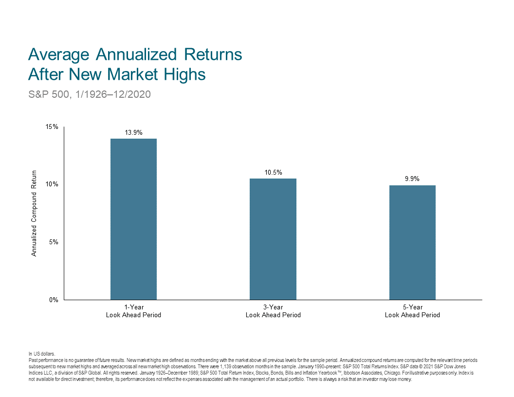 Dimensional Fund Advisors conducted a study of average annual returns following new market highs in the S&P 500 (US large stocks) from January 1926 to December 2020. As you can see in the chart below, they discovered that these 500 stocks returned an average of 13.9% for the next one year, 10.5% for the next three years, and 9.9% for the next five years following all-time highs.